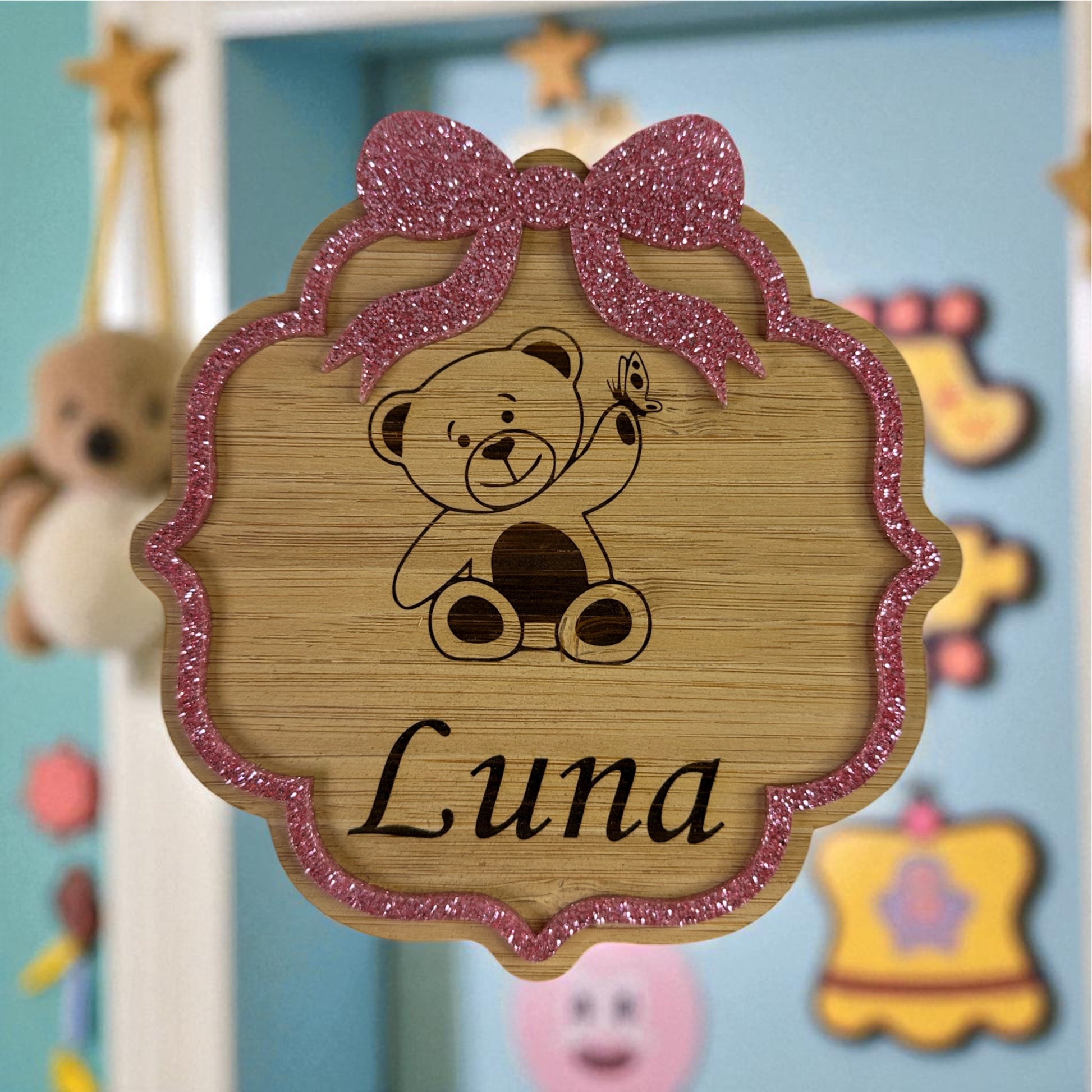 Geef de babykamer een persoonlijke en warme uitstraling met dit lieve houten naambordje. Het bordje is voorzien van een schattige beer met vlinder en de naam van jouw keuze. De roze glitterstrik maakt het helemaal af en zorgt voor een speelse, vrolijke touch.